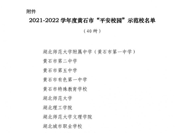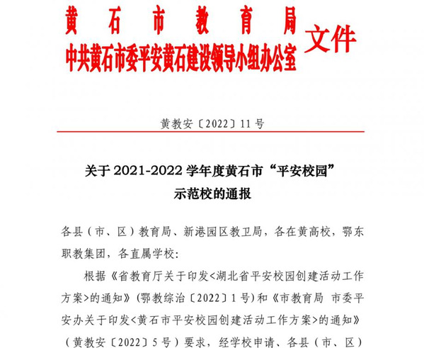 本网讯 根据黄石市教育局、中共黄石市委平安黄石建设领导小组办公室文件(黄教安〔2022〕11号)消息,乐动(中国)一站式服务平台喜获“2021-2022 学年度黄石市平安校园示范校”的荣誉称号。