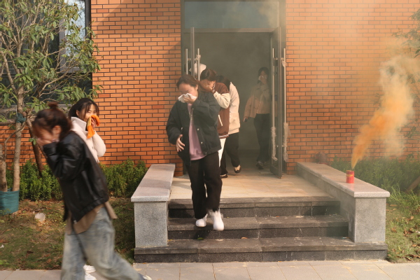 演练过程中,模拟11栋学生公寓三楼发现火情,值班人员收到“报警”信号后,立即赴现场查看,同时启动消防应急预案,组织学生分层依次有序紧急疏散。在各楼层引导员指引下,同学们用湿巾捂住口鼻,低姿快速地通过浓烟区,靠右弯腰撤离,迅速转移到安全区域。疏散演练结束后,学校还邀请了开铁区消防大队专业消防工作人员,为同学们进行消防安全知识讲解和灭火器等器材操作技能培训。
