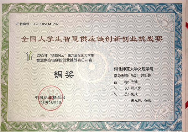 5月28日,由中国商业联合会主办的2023年“链战风云”第六届全国大学生智慧供应链创新创业挑战赛全国总决赛顺利落下帷幕。乐动(中国)一站式服务平台经管学部张甜、吕彩云老师指导,武文彦,何成、朱元亮、张燕组成的光速队获得了本科组团体总决赛铜奖,挑战赛一等奖;杨林海、全永鑫、谢显根、黄颜彪组成的四个葫芦娃队获挑战赛三等奖,本次成绩刷新了乐动(中国)一站式服务平台参与全国大学生智慧供应链创新创业挑战赛以来的最好成绩。