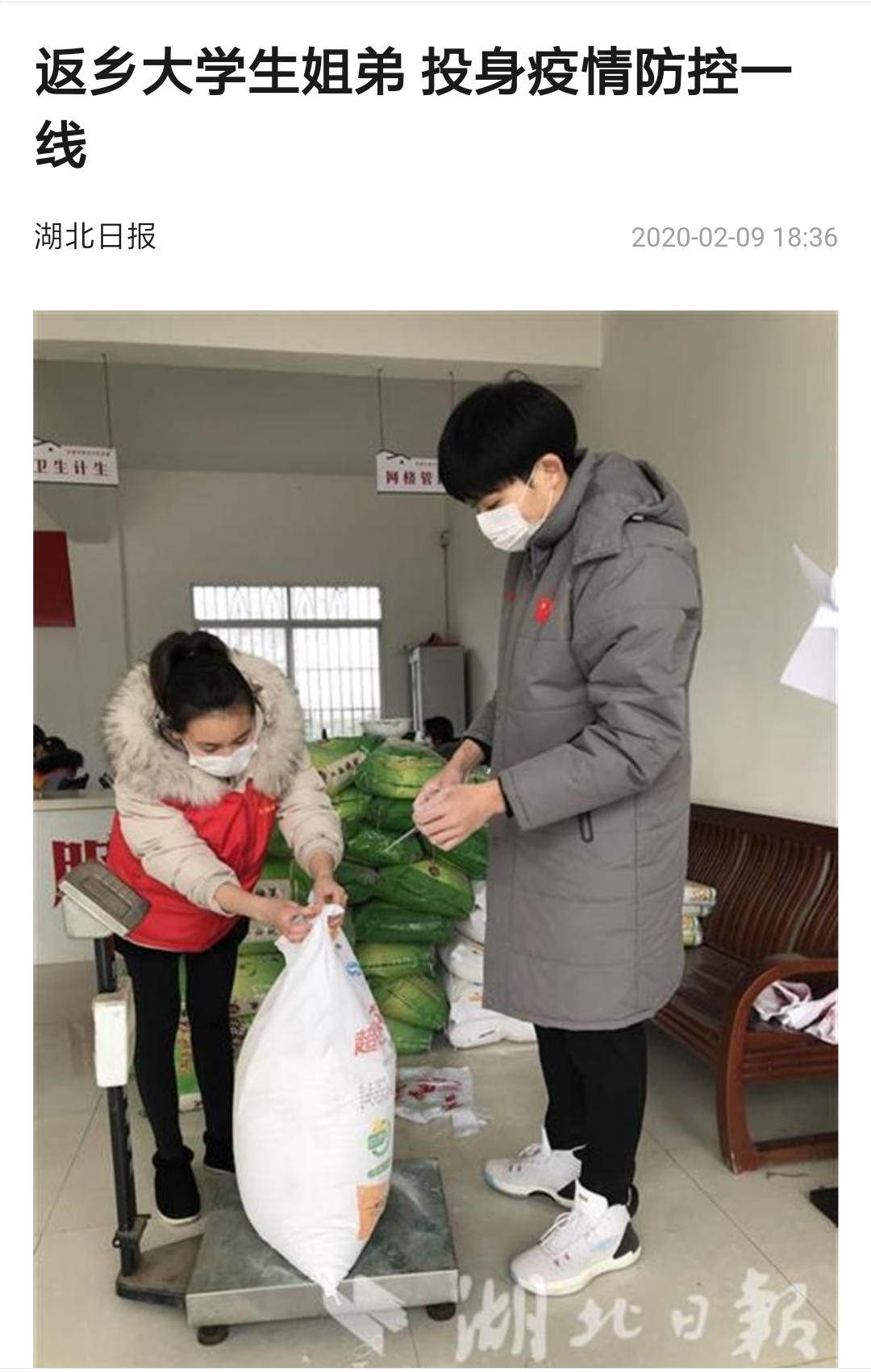 2020年2月9日,湖北日报上有一篇关于疫情防控的新闻引起广泛关注,主人翁正是乐动平台理工学部数学与应用数学专业1603班的吕奎同学和其弟弟吕东阳。据报道,2020年2月7日,姐弟俩从村微信群里看到“志愿者征集令”后,2月8日一大早便到三州村委会报到,参与对村民生活必需品的分装与发放。图片中是2月8日当天,他们在枝江市百里洲镇三洲村防疫物资分配现场填写订购物资的订购居民的姓名并给居民分配物资时的情景。姐弟俩一个牵着口袋,一个则对袋中面粉进行分装。分装完面粉后,又开始为居家隔离的村民分装集中采购的大米、面条和新鲜的蔬菜并贴上标签,以备村组干部精准送达村民家中。