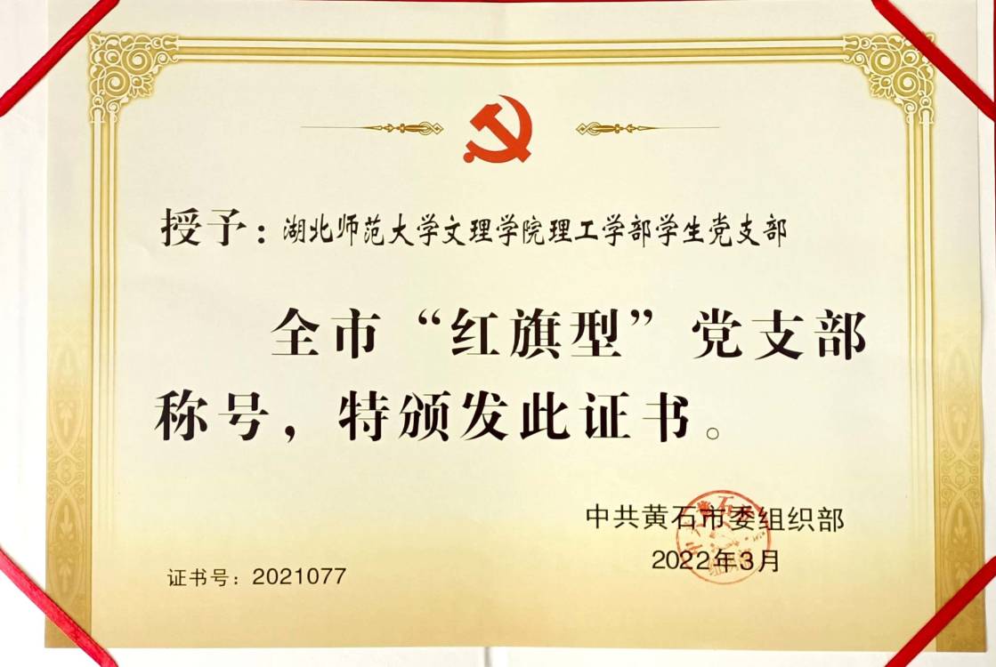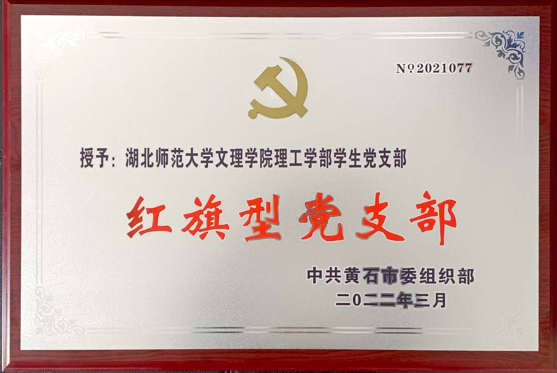 2022年3月,理工学部学生党支部被中共黄石市委组织部授予全市“红旗型”党支部称号。