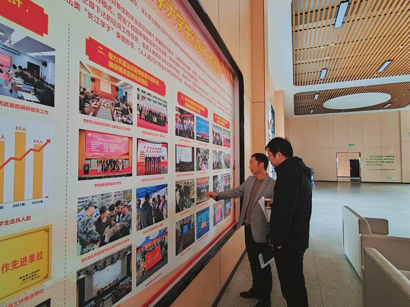 学工交心解难题,智慧办公促发展。在座谈交流中,湖北师范大学学生工作处熊部长对周书记一行的带来表示热烈欢迎,从“追光计划”、“开学第一课”、“一月一主题思想政治建设”、狠抓早读晨练等学风建设、辅导员队伍建设等方面介绍工作基本情况。胡部长主要介绍了“1+4+N”一站式社区建设服务模式,通过办公室全天候开放、建设宿舍驿站、辅导员信息共享、少数民族学生学业帮扶等实现学生工作力量下沉。会上围绕学风建设、辅导员队伍培养、学生资助、网络思政建设以及安全保障、智慧学工系统等方面进行了紧密研讨与互动,会后对征兵工作展览进行参观学习。