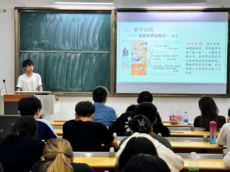 历史学专任教师李紫玫、李文睿、袁文博三位老师担任历史组评委,选手围绕“文艺复兴”“隋朝的统一与灭亡”“百家争鸣”等中外历史主题展切入,结合时间轴、疆域图、文献史料等多维素材,系统梳理历史进程,融入唯物史观与辩证思维。他们不仅展现扎实的史料考据能力,更通过“历史与现实对话”,诠释“以史育人”的教育理念。李文睿老师在点评中强调:“历史教学要平衡形式与内容,避免PPT喧宾夺主。他肯定选手们“结构逻辑清晰、史料运用规范”,同时寄语同学们在未来教学中更注重“历史解释的深度”,帮助学生树立正确的历史观。