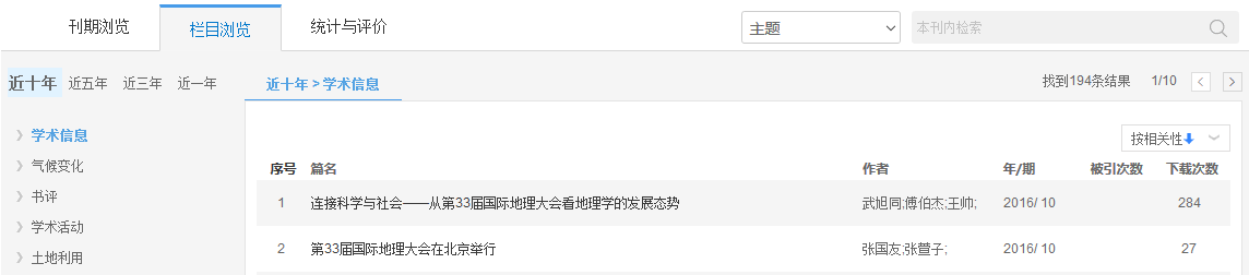 如图5.8.5.3所示,左侧默认展示近十年的栏目信息,还可以切换标签查看近五年、近三年、近一年的栏目信息。右侧为该栏目下的文献列表。