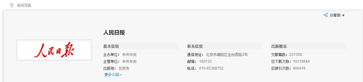 如图5.8.5.1所示,介绍信息包括基本信息、联系信息及出版概况,其中出版概况包括该报的文献篇数、总下载次数及被引次数。默认展示3行信息,点击“更多介绍”,可以查看全部信息。介绍信息右上方提供报纸的分享功能。