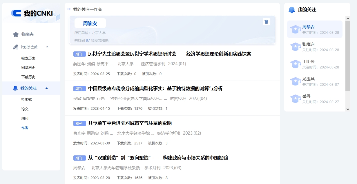 登录个人账号后,可在作者知网节页面点击按钮关注作者。进入我的CNKI-我的关注-作者,可查看已关注作者所发表的文献,管理已关注作者。