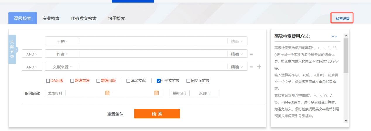 鼠标移入页头“检索”,可选一框式检索、高级检索、专业检索、作者发文检索或句子检索,点击进入相对应检索页面。