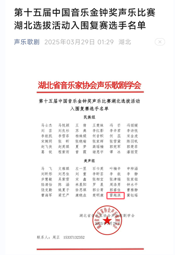 本网讯 (通讯员 刘东辉)近日,第十五届中国音乐金钟奖湖北复赛名单公布,教育与艺术学部音乐教育专业2023级学生雷越淇从湖北省数千名参赛者中脱颖而出,成为本届声乐比赛(美声组)复赛入围选手中年龄最小的“05后”新星,也是唯一的学生身份。这也是继2024年斩获“孔雀杯”全国高等艺术院校声乐大赛金奖后,雷越淇在专业领域的又一次突破。