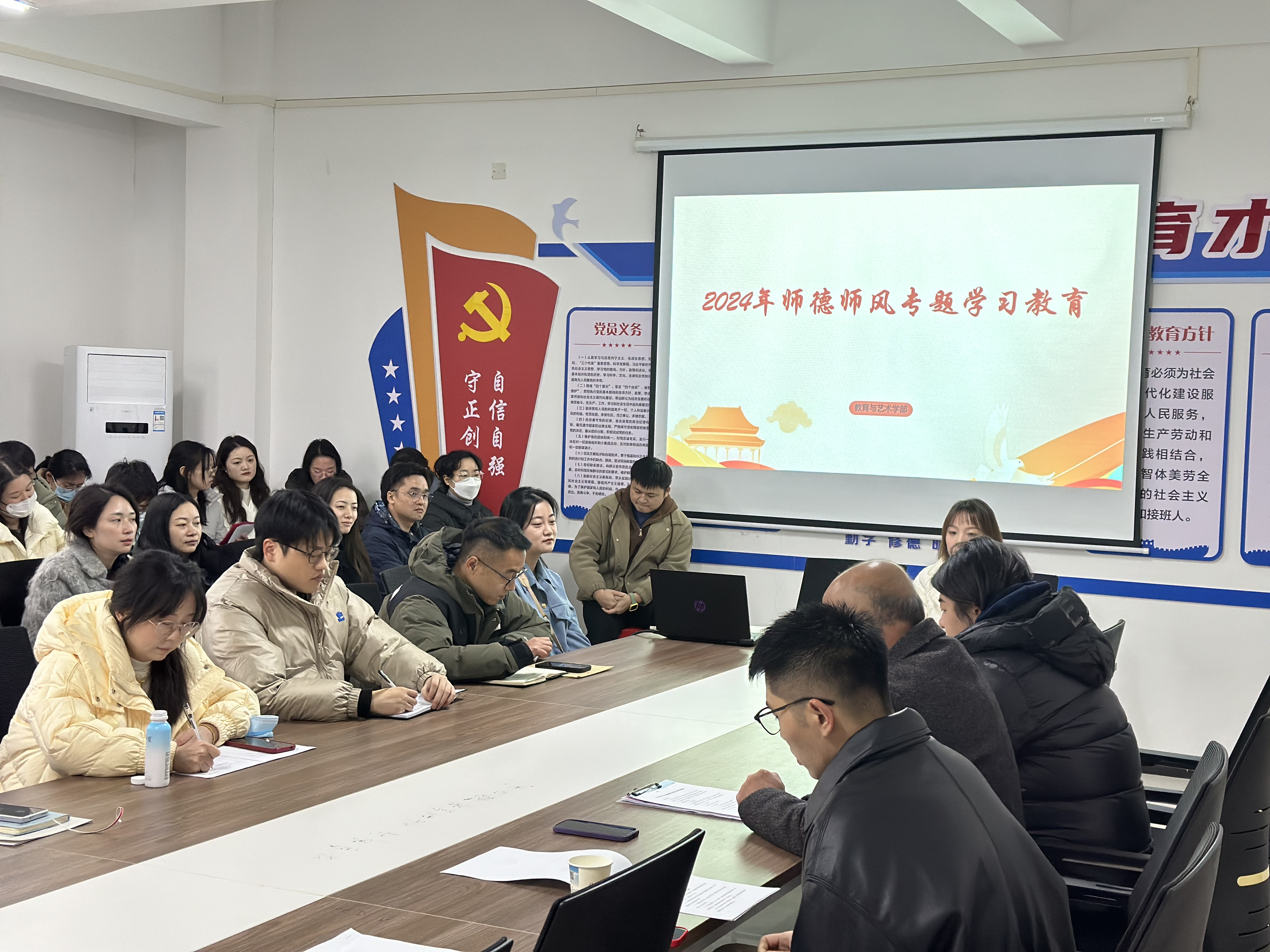 2024年12月11日12:00,我部于实验楼1-414成功召开了师德师风专题学习教育会议。此次会议由党总支书记李先华主持,全体教职工参与,旨在进一步加强师德师风建设,全面提升教师职业道德素养,营造风清气正的教育环境。